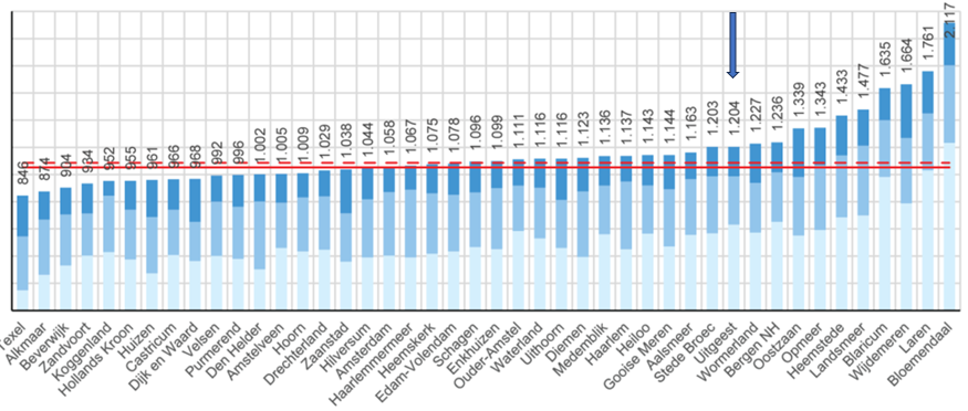 In de ‘benchmark woonlasten Noord-Holland 2025’ zijn 44 gemeenten betrokken. De gemeente op plaats 1 kent met € 846 de laagste gemiddelde woonlasten en de gemeente op plaats 44 de hoogste met € 2.117. De gemiddelde woonlasten in Noord-Holland bedragen € 1.086, het landelijke gemiddelde bedraagt € 1.053.